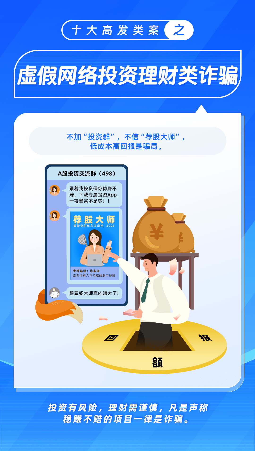 【典型案例二】于某在某直播平台上观看炒股知识直播时,收到自称是主播的好友请求,私聊后双方添加了QQ好友,对方又将于某拉入一投资交流群,于某在群内看见其他人在某款APP投资获利,便下载该APP并按照群管理员的指示在APP内进行投资操作,小额试验都成功盈利并顺利提现。于某感觉获利丰厚,便在APP内累计投资347万元。直至月底,于某发现APP内余额无法提现并被对方拉黑,才发现被骗。