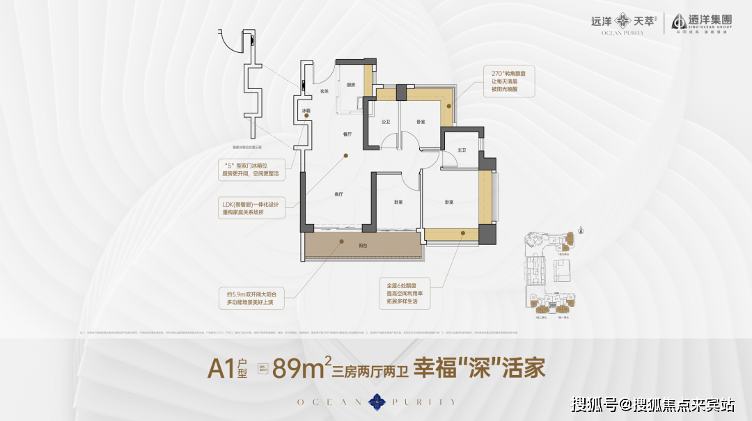 89㎡,到改善的约110-128㎡,均设计了连通客厅和次卧的双开间景观大阳台,尺度达到了约5.9-6.5米。